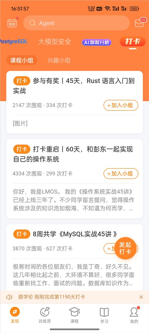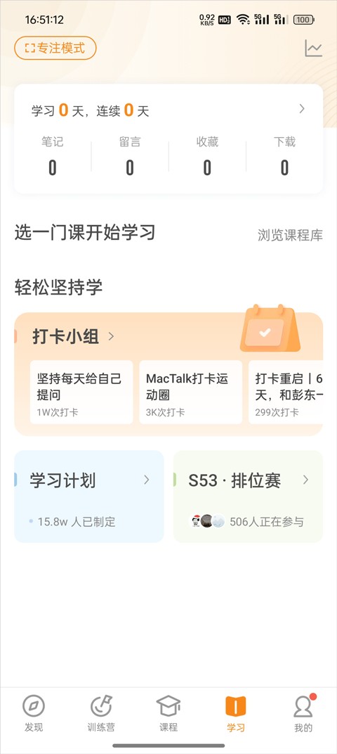 1、进入极客时间App后点击下方导航栏的学习按钮