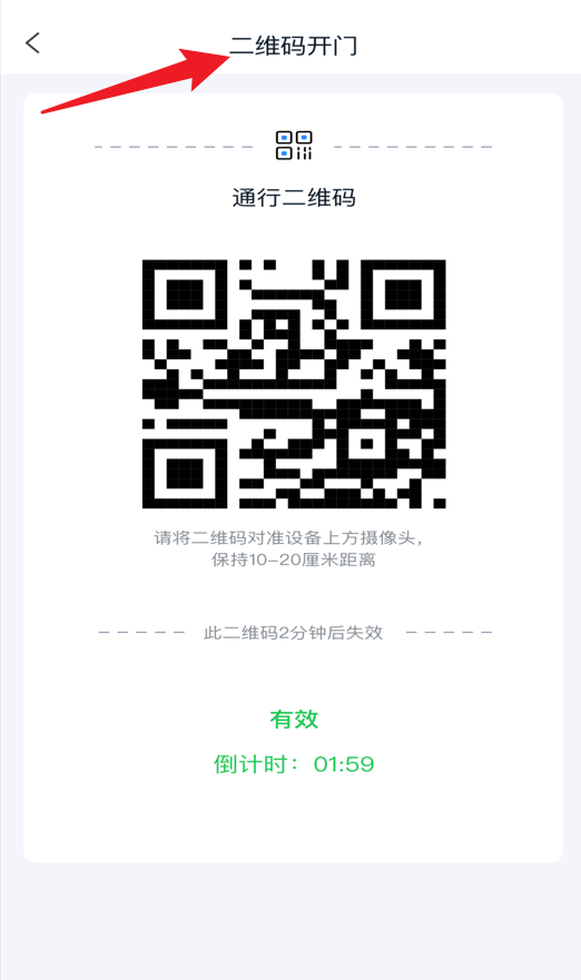 4、支持二维码开门,将二维码对准设备摄像头即可开门,有效期为2分钟。